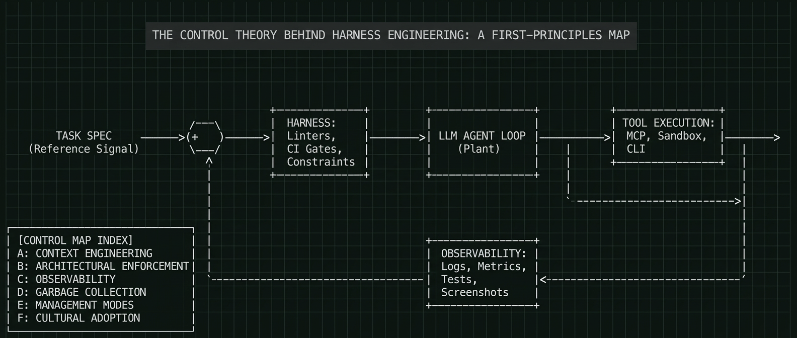 The LLM is the plant. It generates output. The harness is the controller. It constrains, directs, and corrects. Observability (logs, metrics, tests, screenshots) are the sensors. The task specification is the reference signal.